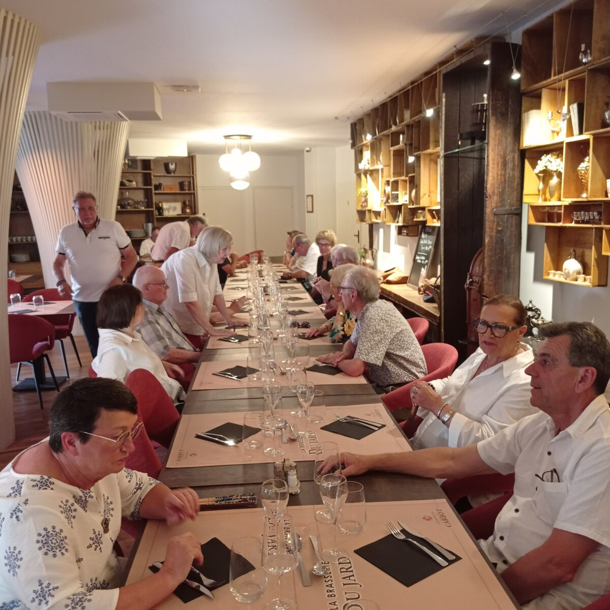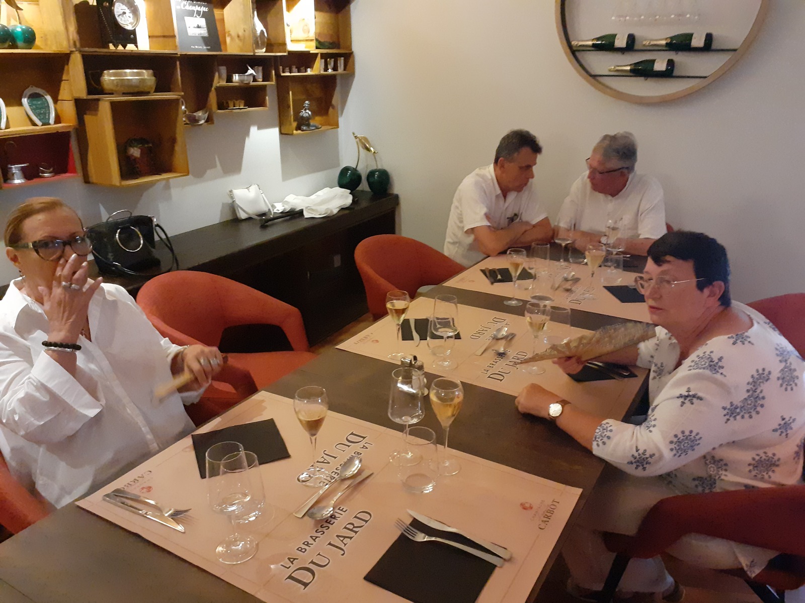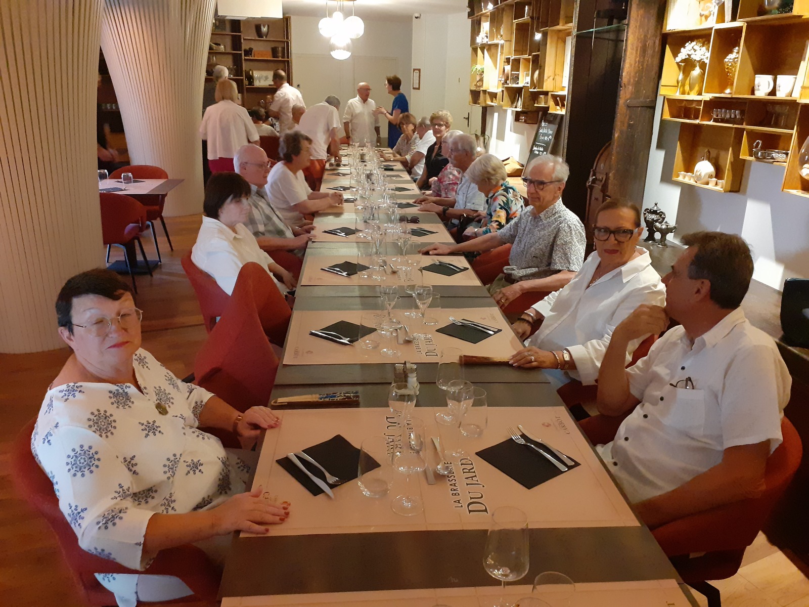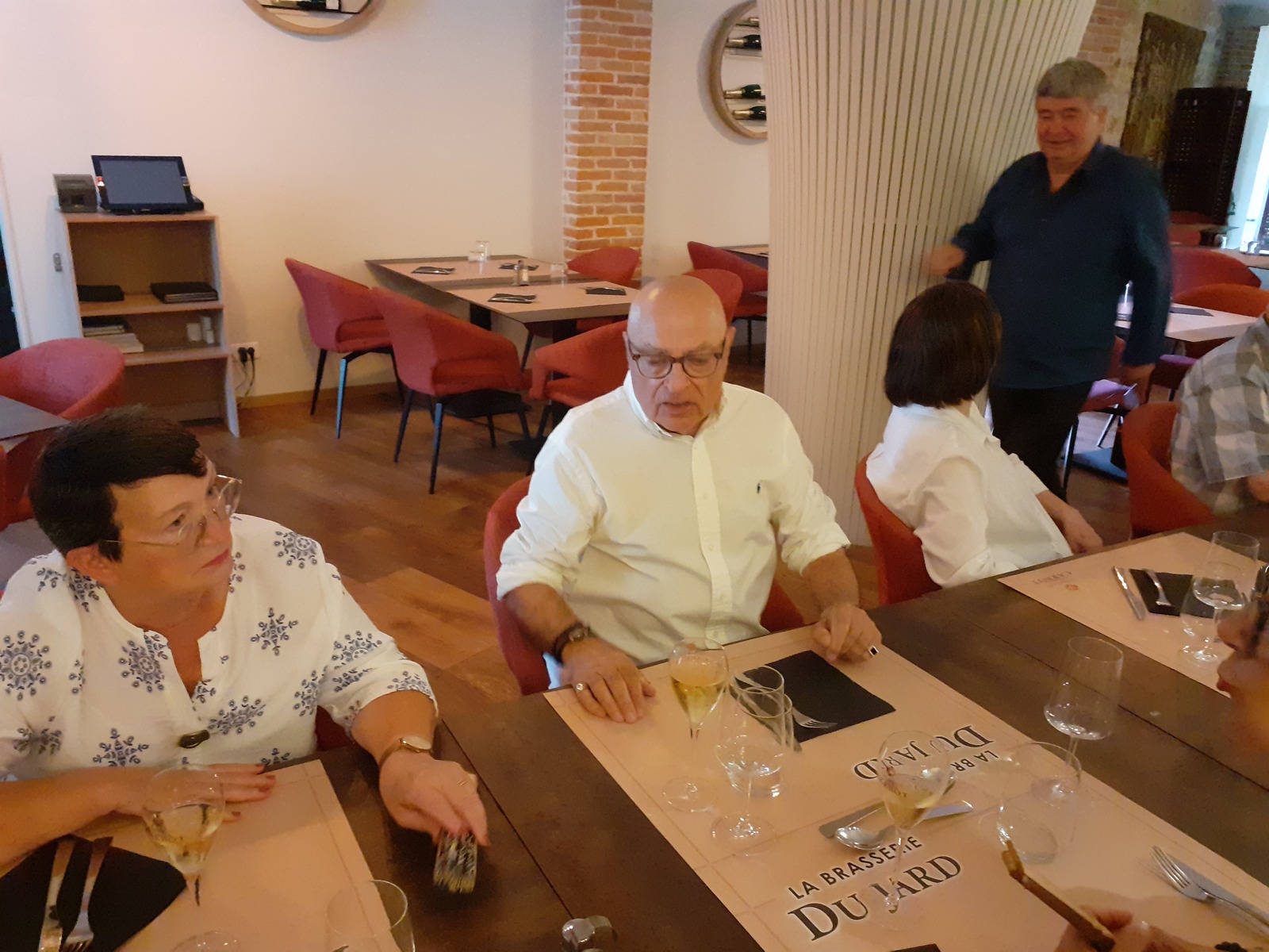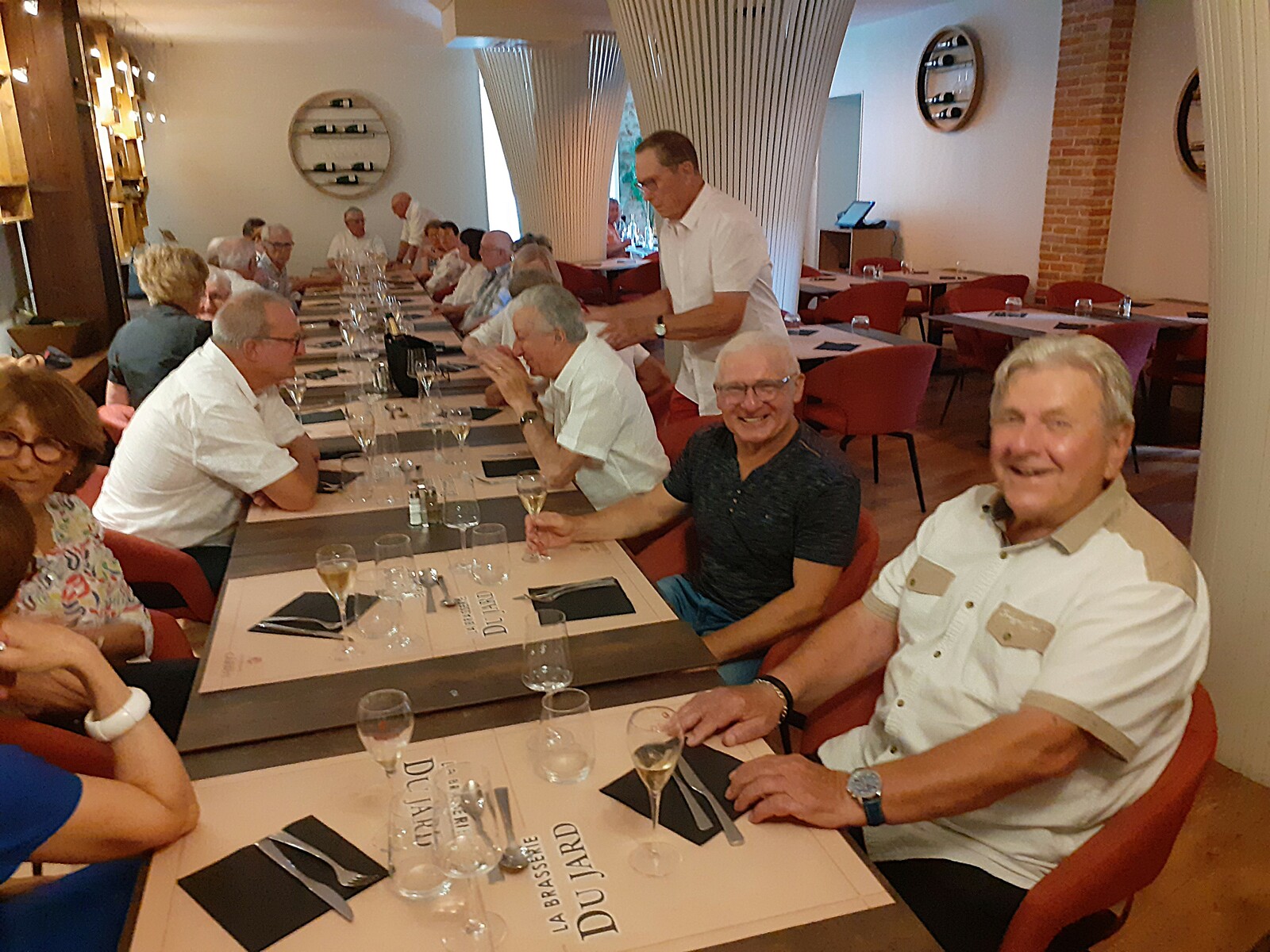 Cette année c'est " La Brasserie du Jard " qui a été retenue pour le repas. Au menu : salade de chèvre chaud ou carpaccio de tomates en entrée, onglet de boeuf ou aile de raie, en plat principal, tiramisu aux fraises ou mi-cuit au chocolat en dessert, champagne, vin blanc et rouge, café.
