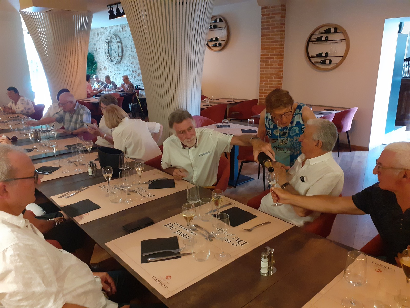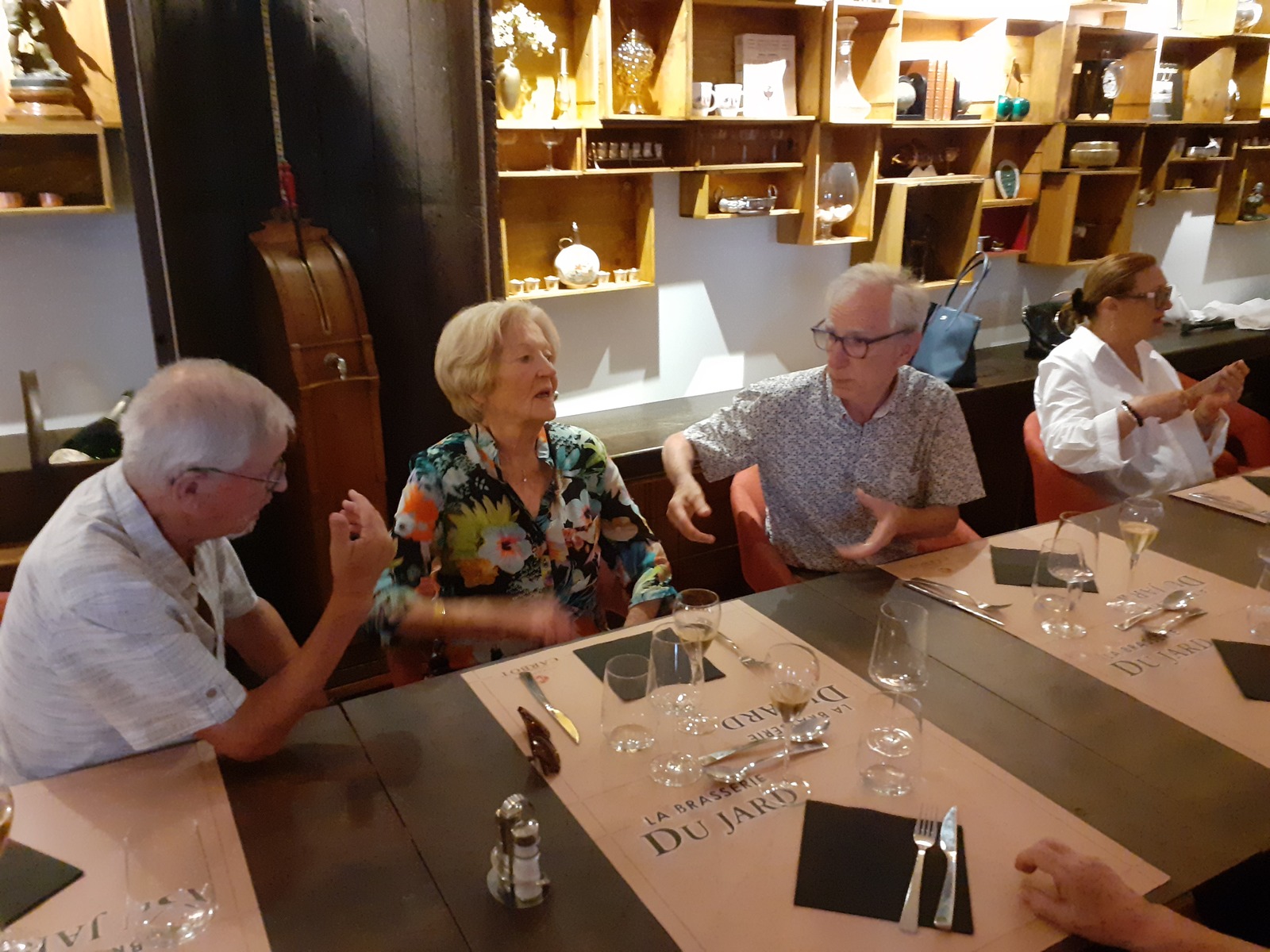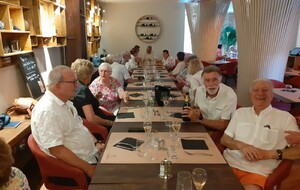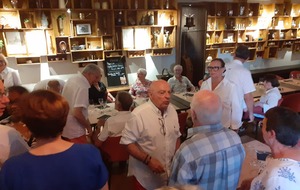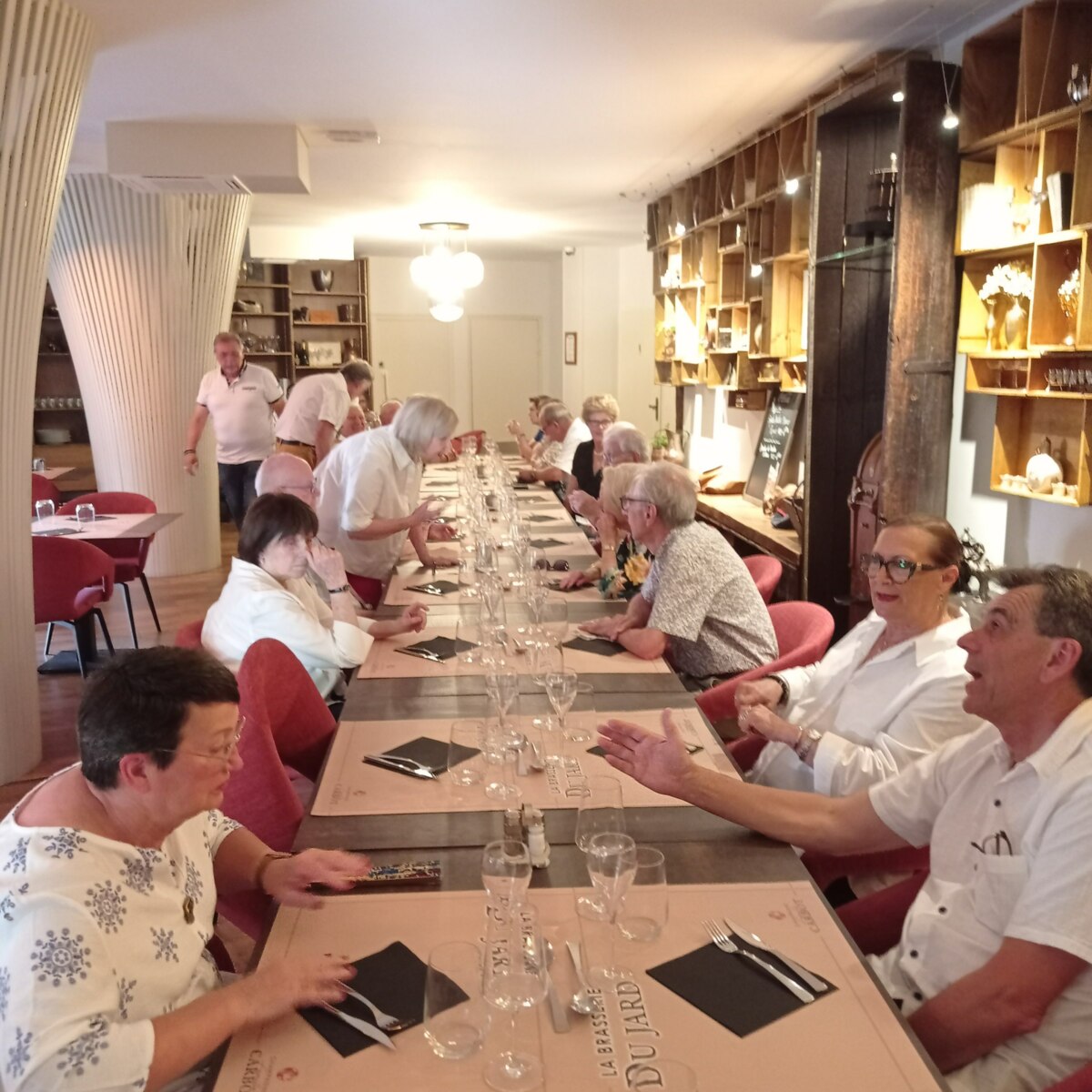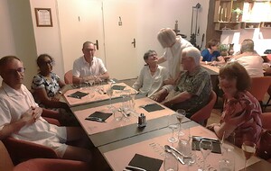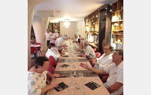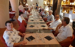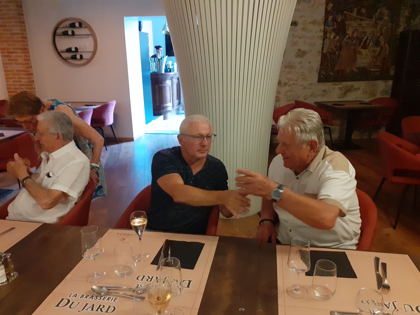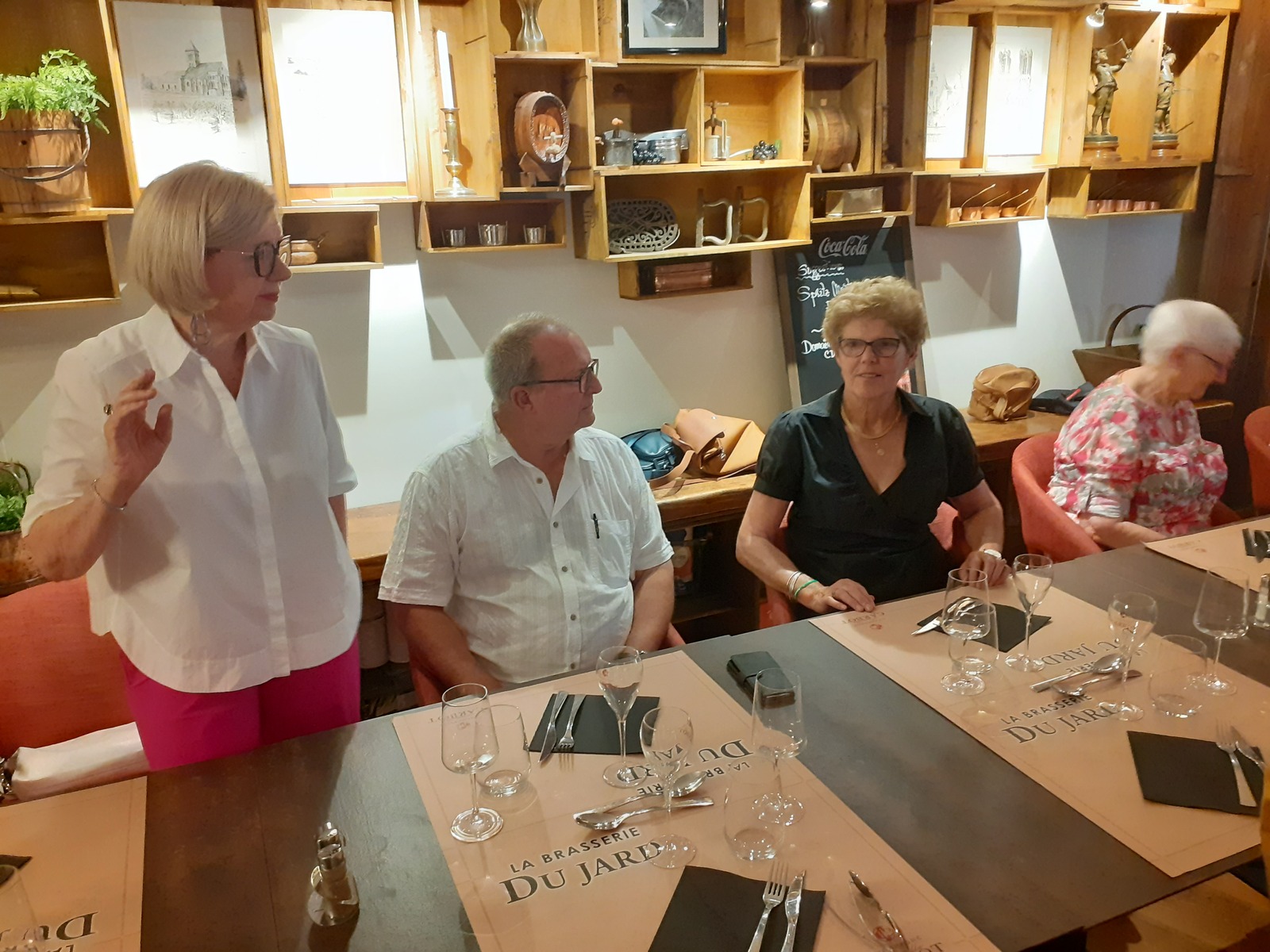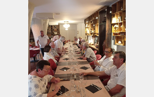Cette année c'est " La Brasserie du Jard " qui a été retenue pour le repas. Au menu : salade de chèvre chaud ou carpaccio de tomates en entrée, onglet de boeuf ou aile de raie, en plat principal, tiramisu aux fraises ou mi-cuit au chocolat en dessert, champagne, vin blanc et rouge, café.