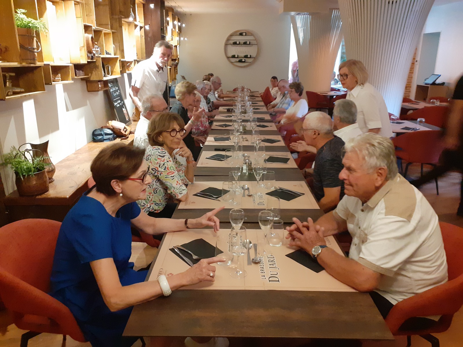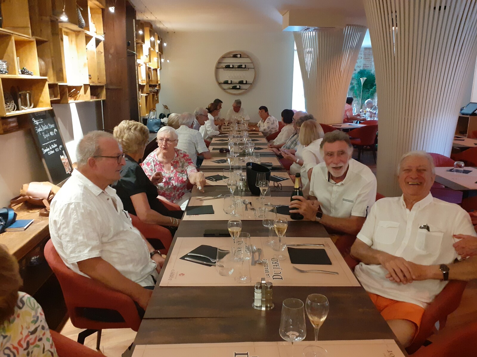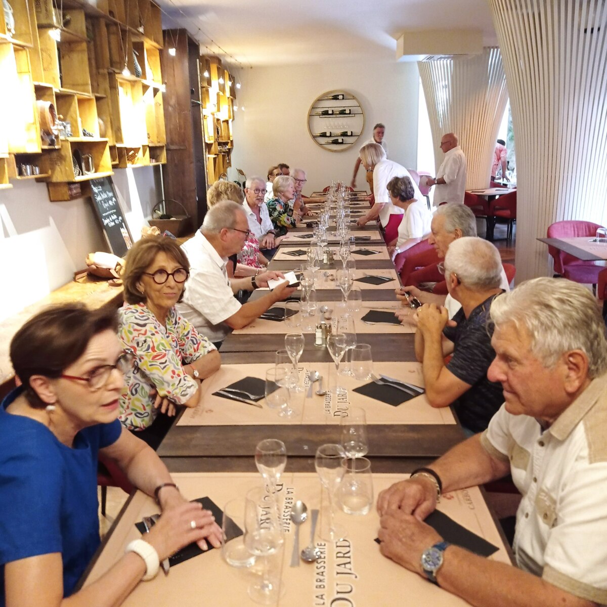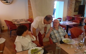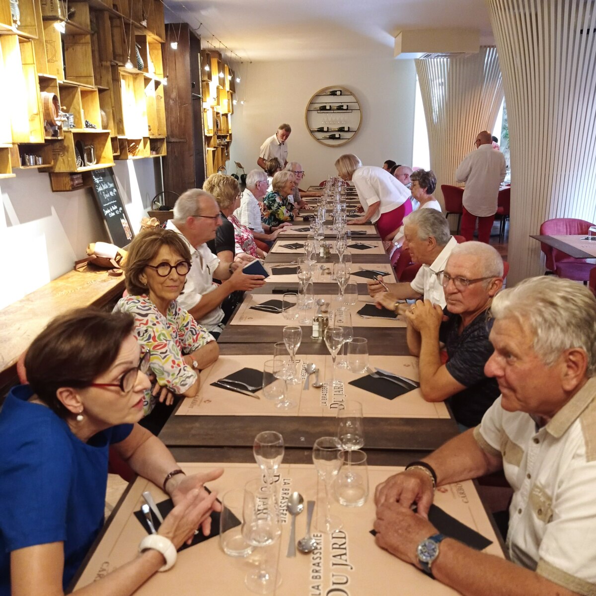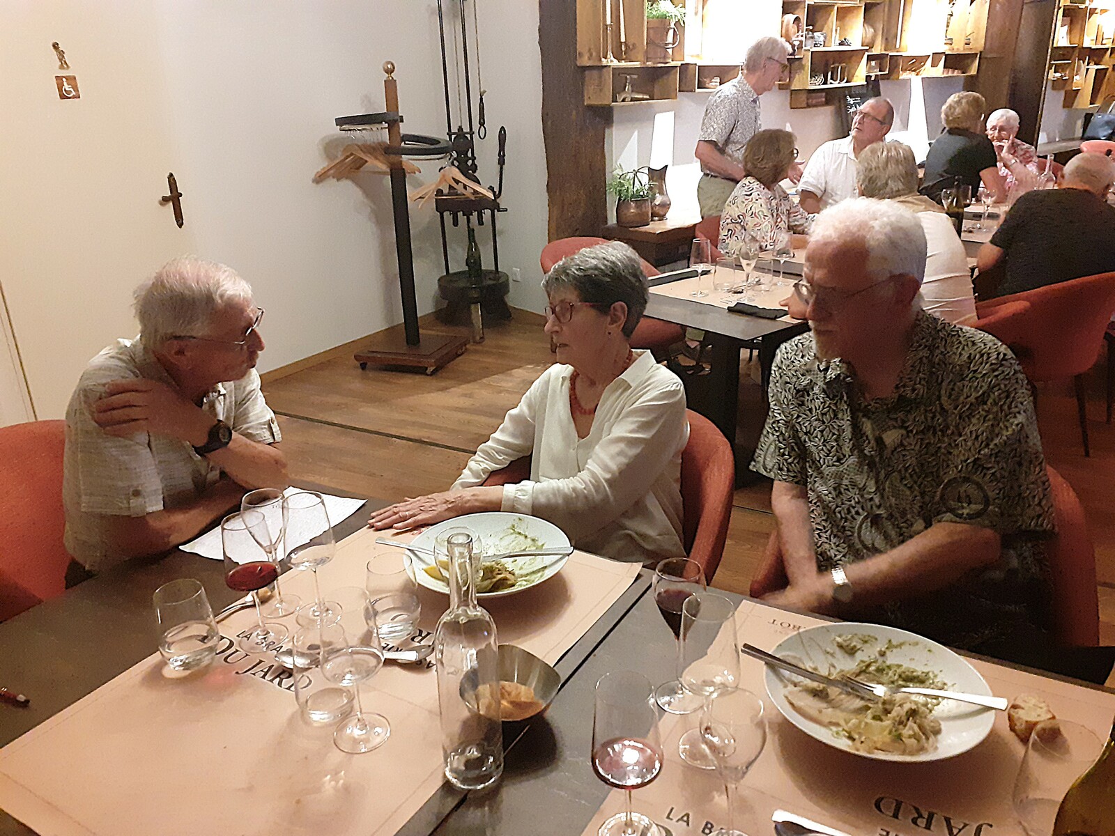 Cette année c'est " La Brasserie du Jard " qui a été retenue pour le repas. Au menu : salade de chèvre chaud ou carpaccio de tomates en entrée, onglet de boeuf ou aile de raie, en plat principal, tiramisu aux fraises ou mi-cuit au chocolat en dessert, champagne, vin blanc et rouge, café.
