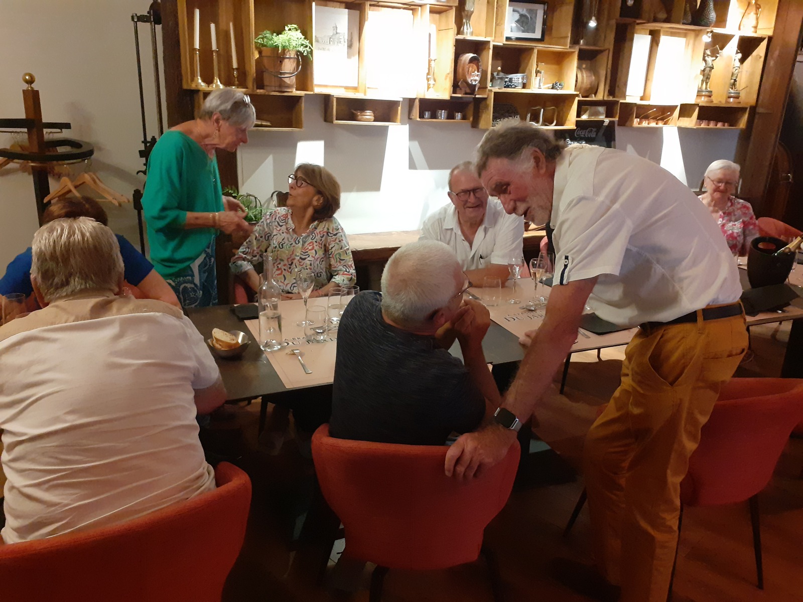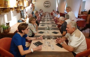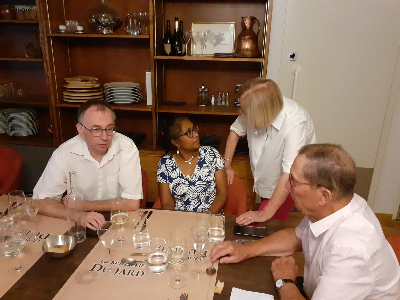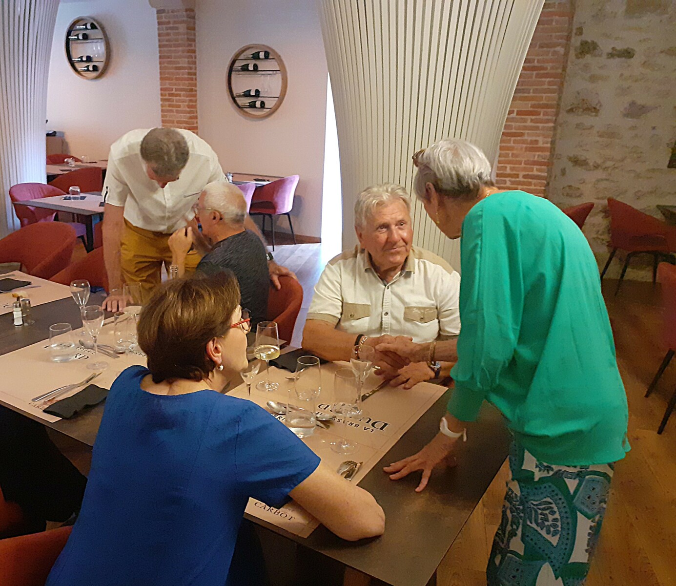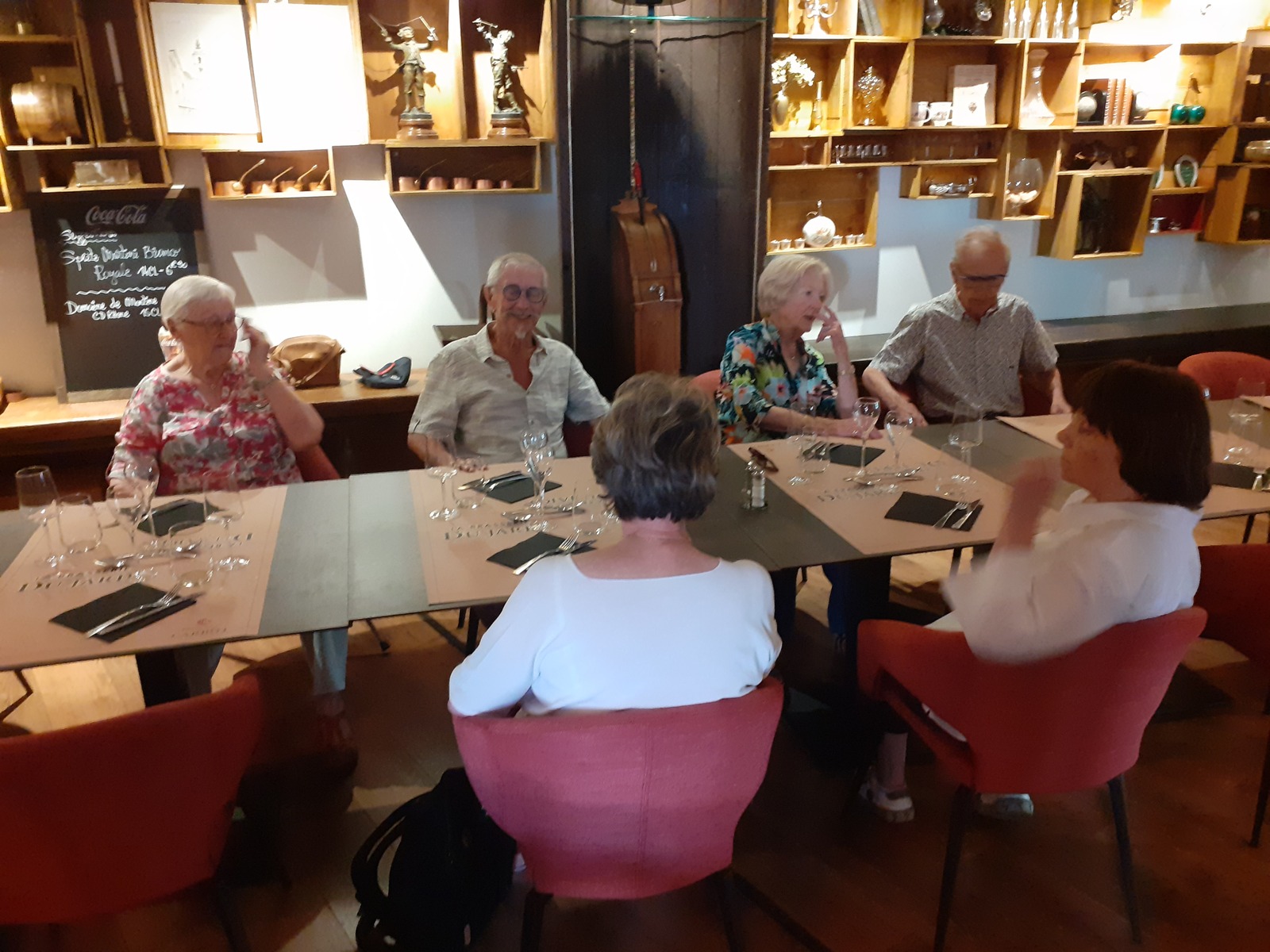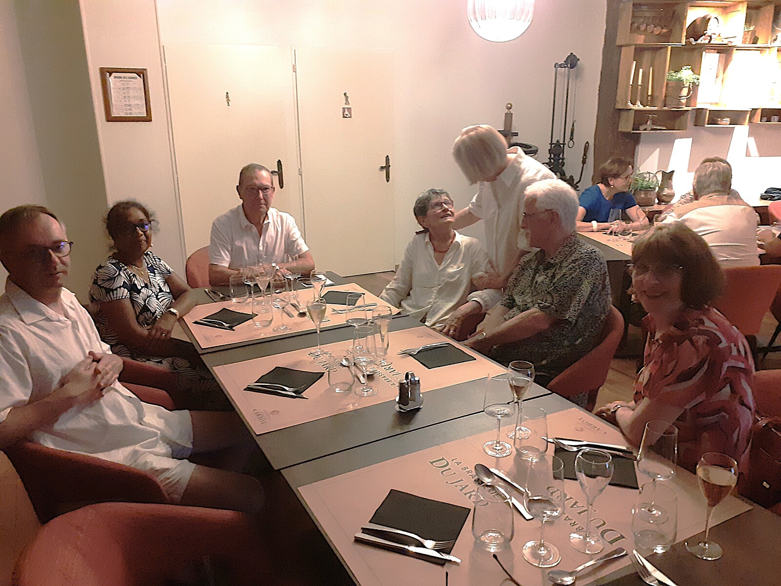 Cette année c'est " La Brasserie du Jard " qui a été retenue pour le repas. Au menu : salade de chèvre chaud ou carpaccio de tomates en entrée, onglet de boeuf ou aile de raie, en plat principal, tiramisu aux fraises ou mi-cuit au chocolat en dessert, champagne, vin blanc et rouge, café.