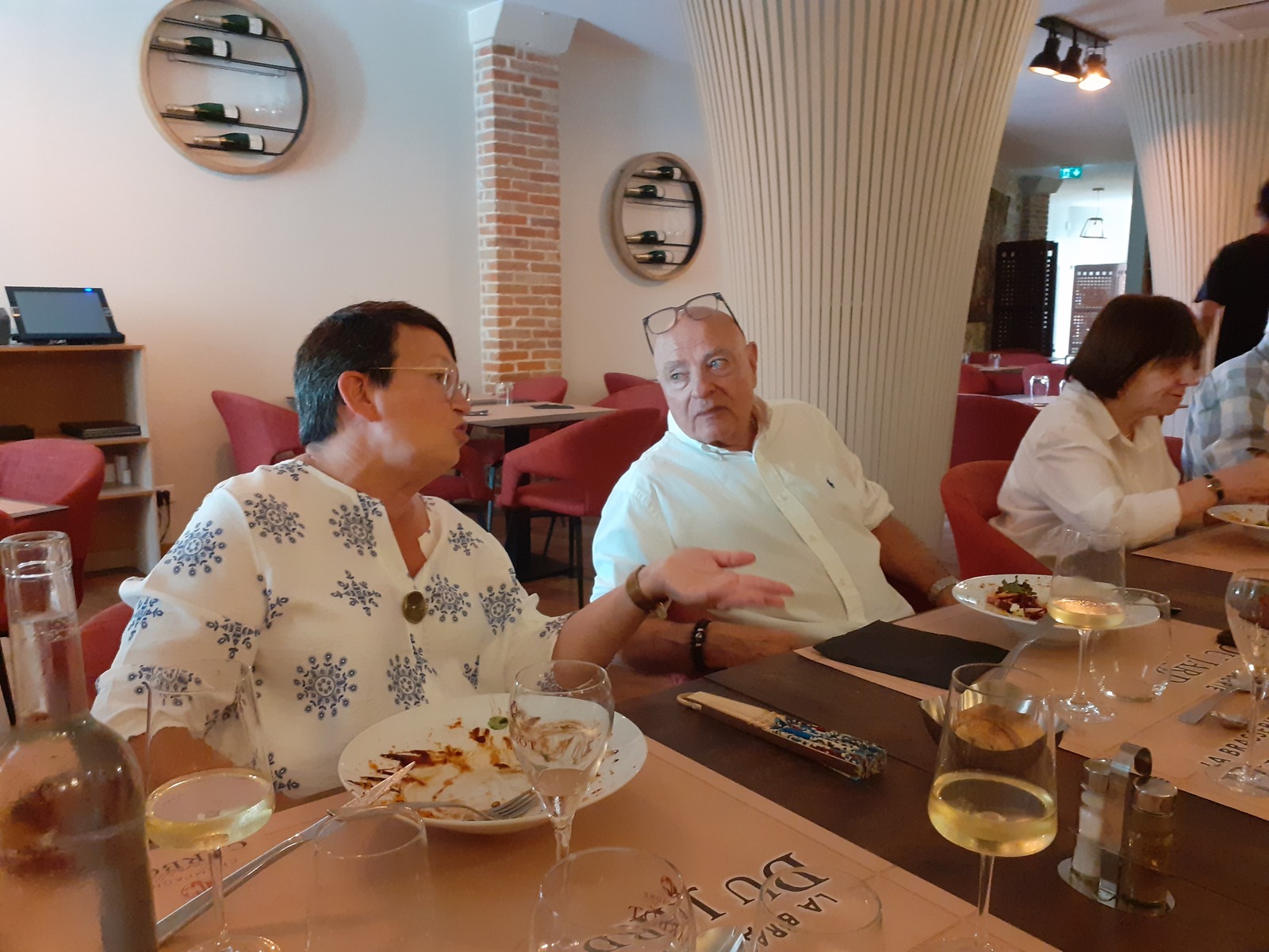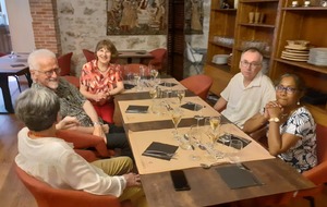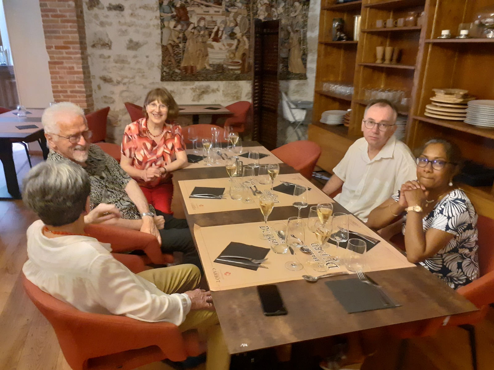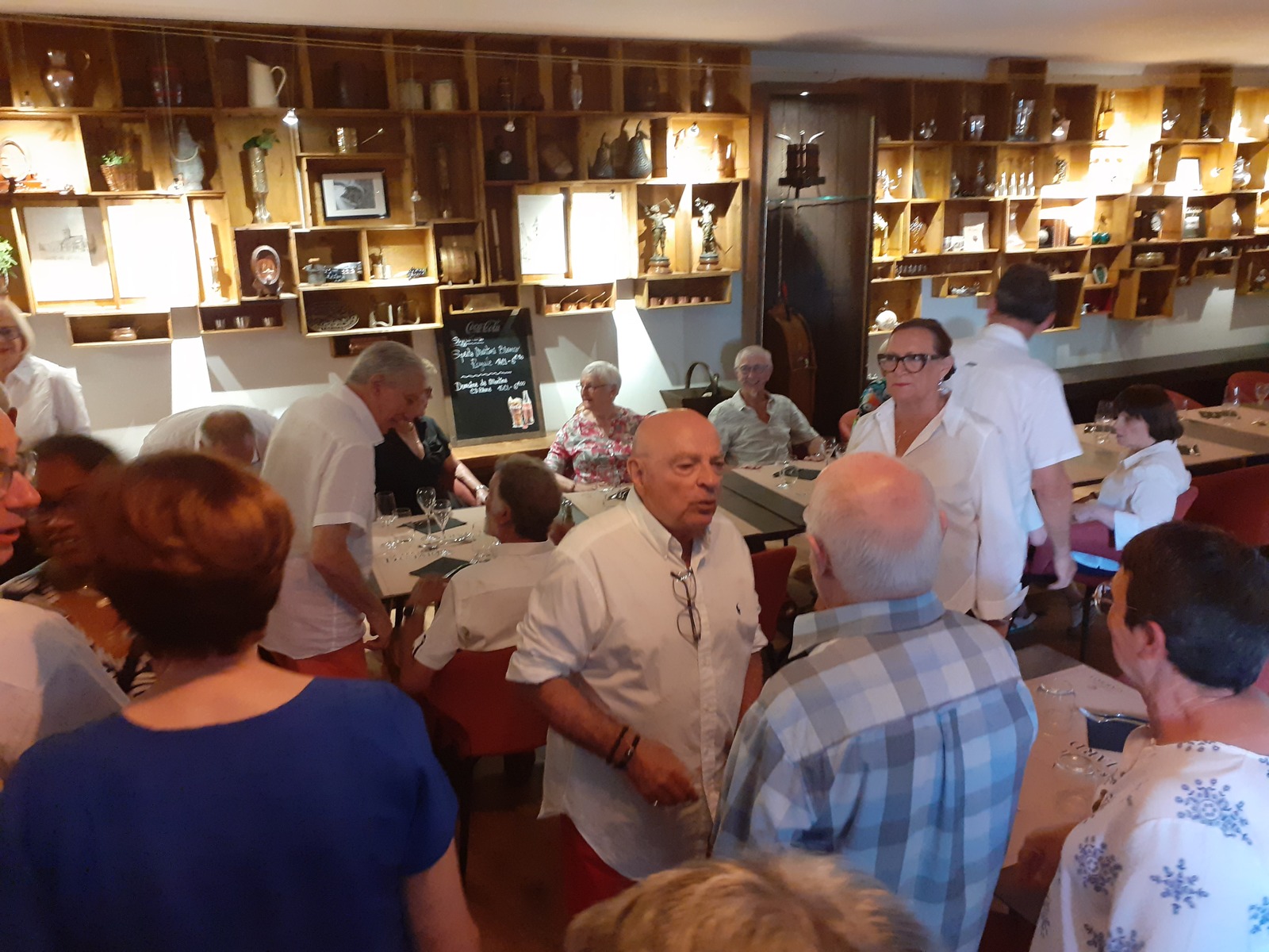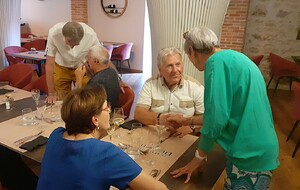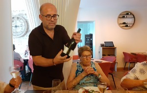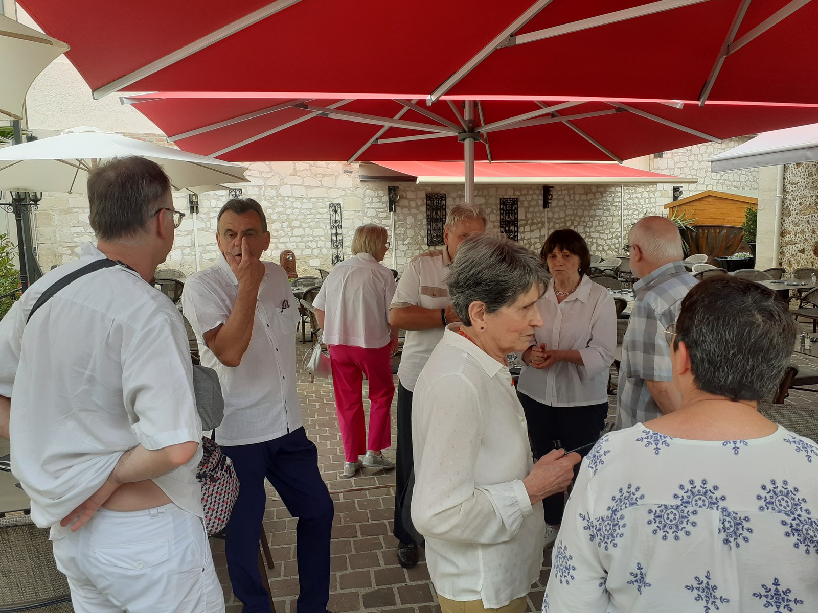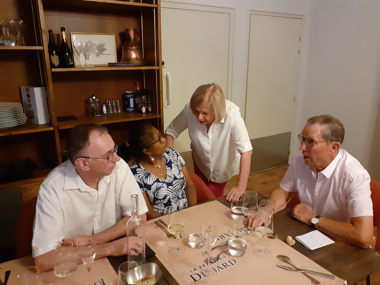Cette année c'est " La Brasserie du Jard " qui a été retenue pour le repas. Au menu : salade de chèvre chaud ou carpaccio de tomates en entrée, onglet de boeuf ou aile de raie, en plat principal, tiramisu aux fraises ou mi-cuit au chocolat en dessert, champagne, vin blanc et rouge, café.