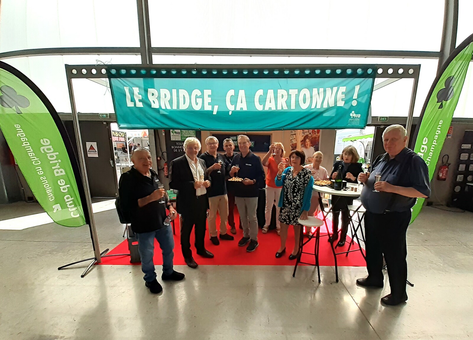 Pour la 2ème année consécutive, le club de bridge de Châlons était présent à la foire, dans le hall 3, du 4 au 7 septembre. Nous avons enregistré plusieurs contacts, 12 au total, grâce au QR Code que nous avons créé pour l'occasion. Les personnes intéressées par la découverte du bridge venaient de Châlons, pour 6 d'entre elles, Reims, Epernay et Vitry. D'autres, plus éloignées, dont Metz et Valenciennes, se sont arrêtées à notre stand, peut-être pour reposer les jambes avant le concert, et certains bridgeurs et bridgeuses d'autres clubs, Champfleury, Laon et Troyes, sont venus échanger avec nous. Le vendredi 5, nous avons accueilli MM. Patrick Bogacki, Président d'honneur de la FFB, Jean-Luc Corpart, Président du Comité Bridge de Champagne et Jean-Pierre Garnier, Délégué Développement du Comité. Ces derniers, accompagnés de Christian Bernard et Annick Conraux, ont participé à plusieurs interviews avec l'union, le Collectif Châlonnais et la radio locale RMN (radio Mau Nau) pour présenter le bridge, son avenir et les démarches menées notamment auprès des jeunes. A noter que la radio RMN nous accueillera prochainement dans ses locaux pour une interview. Merci à notre Président, Claude, Annick Conraux, Bernadette, Brigitte, Catherine, Michèle, Monique, Françoise Schouler, Bruno, Jean-Jacques et Gérard Bruneau pour leur dévouement et leur participation.